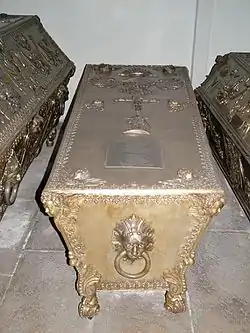Soon after her wedding, Maria Leopoldine became pregnant, and was depicted as such in the 1649 painting by the Italian painter and poet Lorenzo Lippi. The Imperial couple's only child, Archduke Charles Joseph of Austria, was born on 7 August 1649.[9] The childbirth was extremely difficult, ending in the death of the 17-year-old Empress.[10] Her husband remarried within two years, while their son died childless aged 14.[2][7][11] She is buried in tomb 21 in the Imperial Crypt in Vienna. The writer Wolf Helmhardt, Baron von Hohberg, then at the beginning of his career, sent to Emperor Ferdinand III a poem written in honour of the late Empress, called "Poem of tears" (de: Klag-Gedicht).[12]