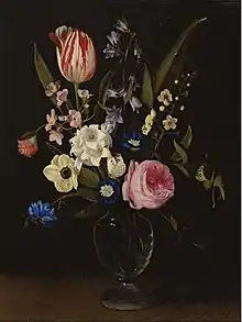 Maria van Thielen was born into an artistic patrician family. According to Cornelis de Bie in his Het Gulden Cabinet her two sisters were painters; Houbraken says she competed with her sisters Anna Maria and Francoise Katharina and was very successful. The sister Anna may well have been her aunt Anna, however, who married the painter Theodoor Rombouts. The three women learned flower painting from their father, Jan Philip van Thielen.[3] Maria's work is in the same style as her father, and probably much of her work has been attributed to him.[4]
