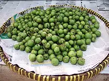 The fruit (resembling a mango) are green in colour and mature to an orange/yellow, with the seed being pink. They grow to roughly 2 to 5 cm (0.7 to 1.9 inches) in diameter. The entire fruit, including its skin is edible. The fruit range from sweet to sour in flavor similar to the Alphonso mango,[1] and have a light smell of turpentine. When ripe, the fruit is soft and has fibrous mango-like seeds.
