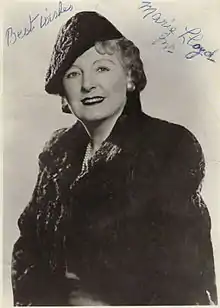 Despite their marital problems, Lloyd went on an American tour with Hurley in 1908. She was eager to equal the success of her sister Alice, who had become popular in the country a few years previously.[121] By 1910, Marie's relationship with Hurley had ended, due in part to her endless parties and her developing friendship with the jockey Bernard Dillon, winner of the 1910 Derby.[3][123][n 21] Lloyd and the young sportsman began an open and passionate affair. For the first time, her private life eclipsed her professional career. She was seldom mentioned in the theatrical press in 1910, and when she did perform, it was not to the best of her abilities.[124] The writer Arnold Bennett, who witnessed her on stage at the Tivoli Theatre in 1909, admitted that he "couldn't see the legendary cleverness of the vulgarity of Marie Lloyd" and accused her songs of being "variations of the same theme of sexual naughtiness."[125] As with Courtenay years previously, the shy and retiring Dillon was finding it hard to adapt to Lloyd's elaborate and sociable lifestyle.[126] Dillon's success on the racecourse was short lived.[127] In 1911, he was expelled from the Jockey Club for borrowing £660 to bet on his own horses to win.[128] Dillon's horses lost, and he ended up in debt to trainers.[127] He became jealous of Lloyd's successful life in the spotlight.[129] Depression led to drink and obesity, and he started to abuse her.[130] Hurley, meanwhile, had initiated divorce proceedings, the strain of which caused him to drink heavily, which in turn finished his theatrical career.[131] Lloyd left the marital home in Hampstead and moved to Golders Green[132] with Dillon, a move which MacQueen-Pope describes as being "the worst thing she ever did."[133]