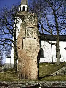 Next to the church stands the Sten Sture stone, erected in 1905, marking the site of the monastery. The inscription reads: "Sten Sture, riddare till Gripsholm, rikets föreståndare, grundade här klostret Mariefred och fick här sin lägerstad år 1504." ("Sten Sture, knight at Gripsholm, regent of the realm, founded here the monastery of Mariefred and received here his resting place in the year 1504").[5]