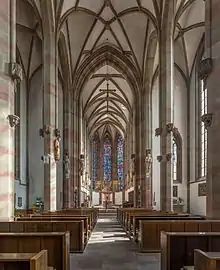 The chapel is a mixture between a basilica and a hall church that was popular in the late-Gothic period. It has three aisles and five bays. The middle aisle is only slightly higher than the side aisles. The roof rests on octagonal pillars. The eastern choir extends three bays. The proportions are somewhat skewed towards the vertical: on a plan of 26.5 meters by 18 meters the nave rises 21.5 meters in the center, 20 meters in the side aisles.[1][2]: 6