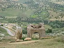 A royal necropolis eventually developed on this site, where some other tombs may have already existed as early as the 11th and 12th centuries (perhaps connected to the nearby Bab Guissa Cemetery).[5] According to the Rawd al-Qirtas, the founder of the Marinid dynasty, Abu Muhammad Abd al-Haqq I (d. 1217), was buried at Tafirtast, a site near Meknes and close to where he had fallen in battle.[6] Up until the middle of the 14th century the Marinid dynasty then buried its rulers in the royal necropolis at Chellah, just outside Rabat.[7] Sultan Abu Inan, however, was interred in the Grand Mosque of Fes el-Jdid upon his death in 1358 and after this his successors, starting with Ibrahim ibn Ali, were buried in the necropolis on the al-Qula hill next to the Marinid palace there.[7][8] (Only one of them was again buried at Chellah, which otherwise became abandoned.[7]) They continued to be interred on this hill between 1361 and 1398 and then again at the end of the dynasty in 1465, when Abd al-Haqq II was buried here.[7][5][8] Two Marinid stelae (tombstones) were discovered near this site in the 20th century: one belonged to a young princess called Zineb who died in 1335 and the other belonged to a high official named Abu Ali al-Nasir who died at beginning of the same century.[9][8] The two stelae are now kept at the Dar Batha Museum in Fes.[8]