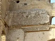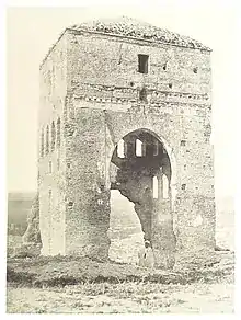Today the ruins of two tall rectangular-base mausoleums with large horseshoe-arch entrances are still visible, along with the remains of other structures.[3][5] The two rectangular mausoleums were once covered by pyramidal wooden roofs covered in green tiles, as evidenced by 19th-century photographs.[6] It is not known exactly who was buried here but given their monumentality they were probably meant for members of the royal family. Some fragments of carved stucco decoration and an Arabic inscription can still be seen on the walls of the mausoleums, which is all that remains of their once rich ornamentation. Leo Africanus mentioned that the tombs were heavily decorated and featured lavish and colourful marble epitaphs.[1][5] The site was probably once enclosed by a wall, giving it the form of a rawda, an enclosed funerary garden or private cemetery in the Islamic tradition.[7][6]