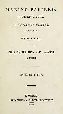 Byron was inspired to take on this subject when, on examining the portraits of the Doges in the Palazzo Ducale in Venice, he discovered that the portrait of Faliero had been blacked out.[1] The main historical source he drew on was Marino Sanuto's Vite dei Dogi (published posthumously 1733).[2][3] He completed the play in July 1820, by which time he was living in Ravenna, and published it in April 1821, along with his The Prophecy of Dante.[4][5] He intended to dedicate it to Goethe, but delays in the post between Italy and England resulted in the play being published without a dedication.[6] The posthumous 1832 edition of Byron's collected works included a later dedication of the play by Byron to his friend Douglas Kinnaird.[7] Marino Faliero was translated into French in 1830 and into Italian in 1838.[1]