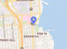 Mariposa (signed as UCSF Medical Center) is a light rail station on the Muni Metro T Third Street line, located in the median of Third Street at Mariposa Street in the Mission Bay neighborhood of San Francisco, California. The station opened with the T Third Street line on January 13, 2007. It has two side platforms; the northbound platform is north of Mariposa Street, and the southbound platform south of Mariposa Street, which allows trains to pass through the intersection before stopping at the station.