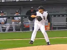 On July 23, 2009, Buehrle threw a perfect game against the Tampa Bay Rays at U.S. Cellular Field.[12][13] It was the eighteenth perfect game in MLB history and Buehrle's second career no-hitter.[14] With the perfect game, Buehrle became the 24th pitcher to throw multiple no-hitters in a career, and the sixth perfect game pitcher who had also thrown another no-hitter, joining Cy Young, Addie Joss, Jim Bunning, Sandy Koufax, and Randy Johnson. (Roy Halladay would join them by pitching two no-hitters in 2010: a perfect game on May 29, and a second no-hitter on October 6, in the NLDS.)[15] Coincidentally, the home plate umpire for both of Buehrle's no-hitters was Eric Cooper (who, coincidentally, shares Buehrle's number 56). He recorded the final out against Jason Bartlett on a ground ball to shortstop Alexei Ramírez. Earlier in the 9th inning, teammate DeWayne Wise, a defensive replacement, made a spectacular catch to rob Gabe Kapler of a home run and preserve the perfect game. Like his previous no-hitter, the game was completed in exactly two hours, three minutes. On July 28, his next appearance, Buehrle retired the first 17 batters he faced before finally allowing a baserunner in the sixth inning, setting an MLB record for consecutive outs at 45,[16] which was later broken on August 28, 2014, by Yusmeiro Petit.[17] Buehrle became only the third pitcher in MLB history (joining Cy Young and Sandy Koufax) to have a no-hitter, a perfect game, and a World Series title with the same team – a feat Buehrle accomplished with the White Sox in 2005 (World Series), 2007 (no-hitter), and 2009 (perfect game).
