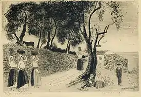 He returned to Corfu in 1911, where he collaborated with the writer, Konstantinos Theotokis in creating the "Socialist Club of Corfu".[1] The following year, he exhibited his works at the Zappeion, and began participating in an artists' society known as the "Fellowship of the Nine". For the remainder of his life, he was a prolific exhibitor; throughout Greece as well as in Paris and Berlin.