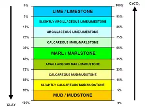 Marl or marlstone is a carbonate-rich mud or mudstone which contains variable amounts of clays and silt. The term was originally loosely applied to a variety of materials, most of which occur as loose, earthy deposits consisting chiefly of an intimate mixture of clay and calcium carbonate,[1] formed under freshwater conditions. These typically contain 35–65% clay and 65–35% carbonate.[2][3] The term is today often used to describe indurated marine deposits and lacustrine (lake) sediments which more accurately should be named 'marlstone'.[4]