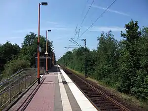Marl-Hamm station is a railway station on the Gelsenkirchen-Buer Nord–Marl Lippe railway in Marl in the German state of North Rhine-Westphalia. It is classified by Deutsche Bahn as a category 6 station[1] and was opened on 27 September 1968.[4] It is located in the north of the city on an embankment. A section of the A 52 runs parallel to the line. It has a side platform and can be reached by stairs and lifts.