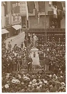 Funds were insufficient to realise this plan, and the memorial, situated in the Buttermarket, was unveiled on 16 September 1891 by Irving, with his statuette as the sole plinth decoration. Rogers asserts that the Memorial awakened a new interest in Elizabethan literature, and quoting Gosse – "Marlowe had been successfully neglected for three-hundred years" noted that "he suddenly became the subject of leading articles in the chief newspapers and magazines, and of paragraphs and leaderettes in minor ones".[1] Although the statue earned the nicknamed Kitty (the playwright was known as Kit), some objections were raised to the statue's dishabille, especially so near the Cathedral. Shrubbery, railings and four lanterns were erected around the statue in 1892.[2]