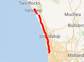 | 40.4 | 25.1 | Yanchep Beach Road – Yanchep, Two Rocks | Marmion Avenue terminus; Roundabout | ||