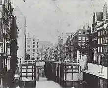 The Martelaarsbrug (bridge no. 29) ran over the Oude Haarlemmersluis, a lock that connected the two parts of the Nieuwendijk. The Spaarndammerbrug, a drawbridge, was at the Texelsche Kade (since 1879 Prins Hendrikkade). Both bridges disappeared when the canal was filled. The canal was filled in 1884, before Central Station was built, at the same time as the Nieuwezijds Voorburgwal.