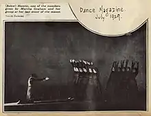 The Graham family moved to Santa Barbara, California when Martha was fourteen years old.[6] In 1911, she attended the first dance performance of her life, watching Ruth St. Denis perform at the Mason Opera House in Los Angeles.[7] In the mid-1910s, Martha Graham began her studies at the newly created Denishawn School of Dancing and Related Arts, founded by Ruth St. Denis and Ted Shawn,[8] at which she would stay until 1923. In 1922, Graham performed one of Shawn's Egyptian dances with Lillian Powell in a short silent film by Hugo Riesenfeld that attempted to synchronize a dance routine on film with a live orchestra and an onscreen conductor.[9]
