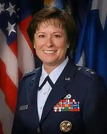 Following graduation, she entered the United States Air Force, and was a 1979 Distinguished Graduate of the United States Air Force Officer Basic Military Training Program at Lackland Air Force Base, Texas.[3] She served on active duty from 1978 to 1984, then transferred to the New York Air National Guard. She also served in the Air Force Reserve before transferring to the Vermont Air National Guard.[4] Rainville specialized in the planning and management of aircraft maintenance and advanced through the ranks to lieutenant colonel and commander of Vermont's 158th Aircraft Maintenance Squadron.[4]