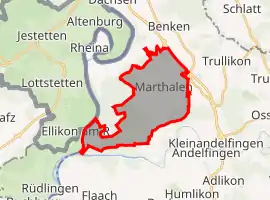 The municipality is located in the Zürcher Weinland (Zurich's vineyards) between the Thur and Rhine Rivers. The village is known for its half-timbered houses. The municipality also includes the village of Ellikon am Rhein, and the hamlets of Niedermarthalen and Radhof.