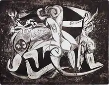 While at Atelier 17, Baooshian was taught the color viscosity etching techniques developed by Hayter and his colleagues. Previous to this time in Paris, Barooshian's graphics output was largely woodcuts and lithographs. However, with intaglio etching, he found the graphics medium that best allowed him to express his personal vision and that would dominate his printmaking for decades.[11][17]