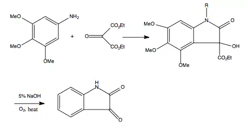 The Martinet dioxindole synthesis proceeds with an alkoxyaniline, 3,4,5-trimethoxyaniline, which reacts with an oxomalonic ester in glacial acetic acid to synthesize 2-carbethoxy-4,5,6-trimethoxyindoxyl, 2-carbethoxy-3,4,5,6-tetramethoxyindole and 4,5,6-trimethoxy-3-hydroxy-3-carbethoxyindole.[6]