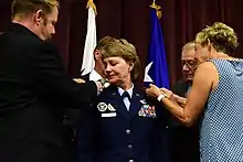 Members of Gen. Maryanne Miller’s family pin on her fourth star during a promotion ceremony at Scott Air Force Base, Illinois, Sept. 7, 2018.