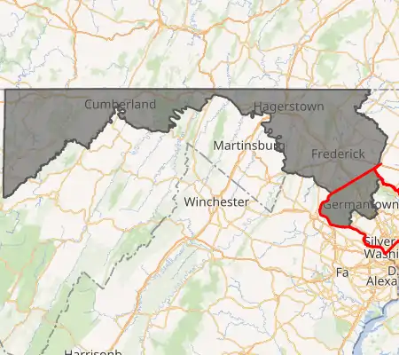 Interactive map of district boundaries, with Montgomery County highlighted in red. In the 2020 redistricting cycle, the district takes in the rest of Frederick County in exchange for some of Montgomery County. | |||