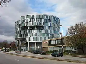 The Dolphin Building at 100 Dolphin Street formerly housed MICA's Printmaking department and Book Arts and Printmaking concentrations, as well as the independent Dolphin Press. It had 15,000 square feet (1,400 m2) of working space divided into three floors. In 2016, MICA demolished the Dolphin Building in preparation of a five story/25,000 square feet structure, designed by Baltimore architectural firm GWWO.[20][21] The building reopened in September 2017, and is now home to the Interactive Arts, Game Design, Product Design, and Architectural Design departments.[20][22]