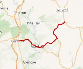 MD 138 begins at an intersection with MD 45 (York Road) in Hereford, one block south of MD 45's intersection with the eastern terminus of MD 137 (Mount Carmel Road). The state highway heads east as two-lane undivided Monkton Road to the village of Monkton, where the highway crosses Gunpowder Falls and intersects the Torrey C. Brown Rail Trail. On the east edge of the village, Monkton Road splits to the southeast and MD 138 veers east onto Shepperd Road, following Charles Run upstream out of the valley. The state highway passes through the area patented in the 18th century as My Lady's Manor. In the hamlet of Shepperd, Shepperd Road ends at Troyer Road. MD 138 turns north onto Troyer Road and Troyer Road heads south as MD 562. The state highway passes through Troyer and curves along a ridge above the headwaters of Little Gunpowder Falls. MD 138 crosses the Baltimore–Harford county line and reaches its eastern terminus at MD 23 (Norrisville Road) in the hamlet of Blackhorse near Shawsville. Troyer Road continues east on the other side of the intersection as a county highway.[1][2]
