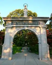 - The Memorial Arch, built in 1902, originally held the inscription "Mt. St. Mary's" and marked the entrance to the original Motherhouse, which was the location of Mt. St. Mary's seminary. Even though the Motherhouse was destroyed by fire in 1971, the arch still stands as the welcoming landmark at the entrance of the campus. The statue of the Virgin Mary on top of the arch is often referred to by students as the "Electric Mary" due to its halo encircled by light bulbs. The original stone steps to the Motherhouse are behind the arch.
