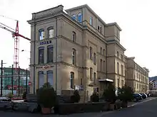 The site of the company's works has been redeveloped, including the innovative public MFO-Park. In the second decade of the 21st century, a project was initiated to expand Oerlikon railway station, with the provision of two additional platform tracks on north-western side of the station. This affected the site of the former office building of Maschinenfabrik Oerlikon, dating from the late 19th century and now a restaurant complex known as Gleis 9. Because of its cultural importance to the region, plans to demolish the building were rejected, and instead the 6,200-tonne (6,800-ton) building was moved 60 meters (200 ft) to the west on specially laid tracks. The move took place in May 2012, and took 19 hours.[2][3][4]