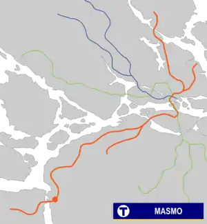 Masmo metro station is a station on the red line of the Stockholm metro, located in Masmo, Vårby, Huddinge Municipality. The station was opened on 1 October 1972 as part of the extension from Vårberg to Fittja.[2] It was the first of the "grottstations" (cave-stations).[3] The distance to Slussen is 16.1 km (10.0 mi).
