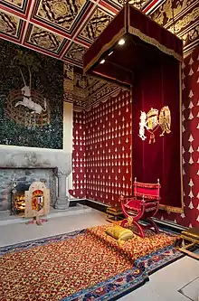 The third day, 30 August, was the baptism proper in the Chapel Royal. Anne of Denmark does not figure in Fowler's account of the ceremony and it seems Annabell Murray, Countess of Mar took her place.[29] An ordinance for the arrangement of furnishing and seats in the chapel survives, the "Form and Ordering of the Chapel for the Baptism".[30] The king's seat and nine seats for ambassadors were provided with cushions and desk cloths made in ten different colours of velvet by the court embroiderer William Betoun. James VI sat on a cushion of "incarnadin vellvot perlit with sillver" - pink velvet edged with silver embroidery. The place for the ambassador from Brunswick was green.[31] A vacant seat in the chapel next to the king was reserved for the French ambassador.[32] The Dutch ambassadors Brederode and Valck found their seat was decorated with the wrong coats of arms, and they asked for the arms of Holland and Zeeland to be taken down and replaced with the shields of the six United Provinces.[33]