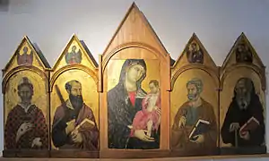 Dismembered (presumably in 1687), the different panels have subsequently undergone numerous changes. The panel of the Madonna and Child was drastically cut down to a rectangular format (and embedded within a larger panel). Long preserved in the church of Santa Cecilia Crevole (Murlo), and long attributed to Pietro Lorenzetti, it was then attributed to the Master of Città di Castello by Mason in 1908, before he arrived at the Museo dell'Opera del Duomo in Siena in 1920. The panels depicting St. Augustine, St. Paul, St. Peter, St. Anthony Abbot, were meanwhile long attributed to Duccio and listed as such by the gallery in Siena in 1894 (inv. No. 29-32), before being reassigned by Nicola 1912 to the Master of Città di Castello. Finally, it was only after a controversy among art historians that lasted throughout the twentieth century that the various panels were physically broughout together again in 2003 on the same support, the whole being now preserved in the Pinacoteca Nazionale (National Gallery) of Siena.