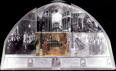 The list of donors demonstrates the importance of the monastery. The cycle was probably completed around the time of the coronation ceremonies of Maximilian as King of the Romans in 1486, and it has been speculated that the reason for the choice of canvas as a support was for ease of moving and displaying the paintings in different locations.[5] Also, this cycle constitutes the first set of paintings of such monumental dimensions produced in Cologne. It is plausible that this work inspired other cycles of saints' lives in Cologne, particularly that created by the Master of the Legend of Saint Ursula.[9]