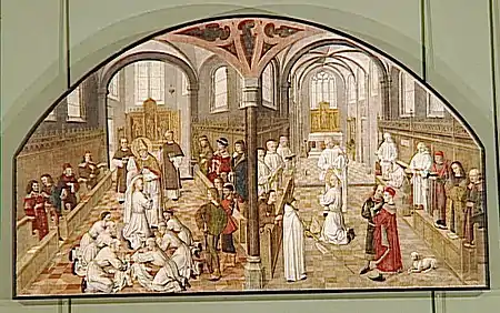 The cycle of paintings was installed in 1489 in the small cloister ("Kleine Galilea") of Cologne Charterhouse, one of the most important Carthusian monasteries. The complete cycle probably comprised 11 paintings representing scenes from the life and legend of Saint Bruno, the founder of the order in the 11th century. It was also a means of presenting the order itself, its objectives and importance.[4] At the time when the cycle was painted, Bruno had not yet been canonised.