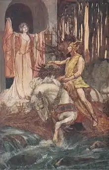 When Math hears of the assault on Goewin, he turns his nephews into a series of mated pairs of animals: Gwydion becomes a stag for a year, then a sow and finally a wolf. Gilfaethwy becomes a hind deer, a boar and a she-wolf. Each year they produce an offspring which is sent to Math: Hyddwn, Hychddwn and Bleiddwn. After three years, Math releases his nephews from their punishment and begins the search for a new foot-holder. Gwydion suggests his sister Arianrhod, who is magically tested for virginity by Math. During the test, she gives birth to a "sturdy boy with thick yellow hair" whom Math names Dylan and who takes on the nature of the seas until his death at his uncle Gofannon's hands.
