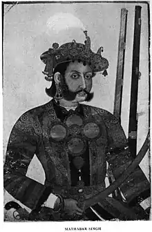 Mathabar Singh Thapa  listen  (Nepali: माथवरसिंह थापा, born 1798, Borlang, Gorkha – 17 May 1845, Basantapur, Kathmandu), also spelled Mathbar, Mathawar, Mathavar,[2] variantly called Matabar Singh Thapa (Nepali: मातवरसिंह थापा),[3] was the Prime Minister of Nepal and the Commander-In-Chief of the Nepalese Army from 1843 December 25 – 1845 May 17, until he was murdered by his nephew Jung Bahadur Rana. He was the first Mukhtiyar[note 1] to title himself as a Prime Minister, as per the British convention.[4][note 2] He was the nephew of Bhimsen Thapa, who was falsely sentenced for imprisonment for the death of King Rajendra's six months old son. Mathabar Singh Thapa fled to Shimla[5] after the execution of Bhimsen Thapa, to avoid his own execution as he was Bhimsen's nephew. Four years later, the second queen of Rajendra, Queen Rajya Lakshmi, called him back and installed him as the Mukhtiyar, paving the way for him to eventually title himself as the Prime Minister.. Mathabar Singh, however, enraged the queen by refusing to make her son, Ranendra Bikram, the king. The queen, in turn, had him shot by his own nephew Janga Bahadur Rana and thereby making him the last dynast of the Thapa dynasty.