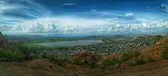 Madurai is located at 9.93°N 78.12°E.[56] It has an average elevation of 101 metres. The city of Madurai lies on the flat and fertile plain of the river Vaigai, which runs in the northwest–southeast direction through the city, dividing it into two almost equal halves.[57] The Sirumalai and Nagamalai hills lie to the north and west of Madurai. The land in and around Madurai is utilised largely for agricultural activity, which is fostered by the Periyar Dam.[58] Madurai lies southeast of the western ghats, and the surrounding region occupies the plains of South India and contains several mountain spurs.[59] The soil type in central Madurai is predominantly clay loam, while red loam and black cotton types are widely prevalent in the outer fringes of the city. Paddy is the major crop, followed by pulses, millet, oil seed, cotton and sugarcane.[60]