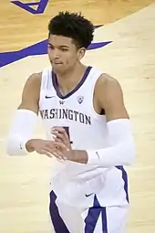 Thybulle chose to attend the University of Washington in Seattle based on his relationship with Huskies coach Lorenzo Romar.[12] He started all 34 games as a true freshman in 2015–16, averaging 6.2 points, 3.2 rebounds, and 1.6 assists in 24.1 minutes per game.[7] As a sophomore in 2016–17, he averaged 10.5 points, 3.1 rebounds, and 2.1 steals,[13] but the Huskies won only two games in conference and were 9–22 in Romar's fifteenth season at Washington, and he was fired.[14]