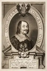 He collaborated on an important publication of portraits of the delegates to the peace negotiations for the Peace of Münster. This was a publication project of the Flemish painter Anselm van Hulle who was present in Münster where he had made portraits of the delegates to the conference. As court painter to the Prince of Orange, van Hulle had been able to obtain a printing privilege in March 1648. He had reproductions made from his sketches by Mattheus Borrekens and other leading engravers in Antwerp, such as Paulus Pontius, Coenraet Waumans, Cornelis Galle the Younger and Pieter de Jode II. The engravings were made on copper plates with a size of approximately 30 x 20 cm (Folio format) and printed on large-format paper sheets of up to 41 x 32 cm. The prints show the bust of the delegate in an oval in which his motto is inscribed, above him the coat of arms of the entity that the delegate represents at the peace negotiations, below the coat of arms of the delegate's family and below this a cartouche with the delegate's titles. The architectural framework of each portrait is in the form of an epitaph which emphasises that the portrait was made for posterity.[5]