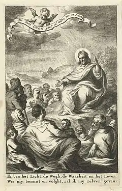 ![]() "Sermon on the Mount" (De Bergrede). Book illustration from Thomas à Kempis (translator: Jurriaen Bouckart ), De vier boeken der naarvolging Christi, Jacob Lescailje (publisher), Amsterdam 1663. | |