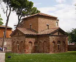 The "mausoleum" of Galla Placidia, built 425–450, is a cruciform chapel or oratory that originally adjoined the narthex of the Church of the Holy Cross (Santa Croce) in Ravenna.[1][6] It was probably dedicated to Saint Lawrence.[1]
