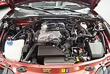 The fourth generation MX-5 is 105 mm (4 inches) shorter and 100 kg (220 lb) lighter than its predecessor, putting the vehicle's curb weight near 1,000 kg (2,200 lb). Incorporating Mazda's Skyactiv technology, the Miata is offered with a choice of two direct injection, naturally aspirated petrol engines. The base model has a 1.5 L 96 kW (129 hp; 131 PS) engine, while the 1,998 cc (2.0 L; 121.9 cu in) North American (United States and Canada) pre-2019 cars are rated at 116 kW (155 hp; 157 PS) at 6000 rpm and 201 N⋅m (148 lb⋅ft) at 4600 rpm of torque.[11] Mazda also replaced the hydraulic power steering system that the previous Miatas had with their new Electric Power Assisted Steering (EPAS) system.[12]
