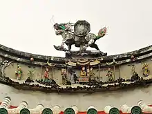 The temple is filled with wood carvings in the Chaozhou style. The name plaque on the front temple is surrounded by three dragons. The swastikas on the main hall's door panels are taken to represent eternal prosperity; wealth and happiness are also symbolized by the doors' flowers and birds. The columns have lion and paired rabbit bases.[2][4]
