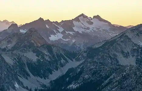McGregor Mountain is an 8,122-foot (2,476-metre) elevation massif located in the Stehekin Valley of the North Cascades, in Chelan County of Washington state.[4] McGregor Mountain is situated northwest of Lake Chelan in the northern Methow Mountains, on the shared border of North Cascades National Park and Lake Chelan National Recreation Area. The closest community is Stehekin, and the nearest higher neighbor is Goode Mountain, 7.3 miles (11.7 km) to the northwest.[1] Precipitation runoff from the mountain drains into tributaries of the Stehekin River. Topographic relief is significant since the southern aspect of the mountain rises 6,600 feet above this river in approximately two miles. The famous Pacific Crest Trail traverses the western base of this mountain, and the strenuous 7.7-mile (12.4 km) McGregor Mountain Trail gains 6,400 feet (1,920 m) of elevation to take hikers within a half-mile of the summit. Reaching the summit requires exposed scrambling the final 1,100 feet (330 m), and an ice axe is needed if the trail remains covered by snowpack.[5] The summit was the site of an old fire lookout cabin from 1923 until 1955, but now has a radio repeater for the National Park Service. The views from the top include Glacier Peak, Black Peak, Corteo Peak, Frisco Mountain, Tupshin Peak, Dome Peak, Glory Mountain, and many others. This mountain was named for Billy McGregor, a Stehekin Valley resident who had a cabin and homestead at the base of this mountain during the 1890s.[3] In May 1901, Billy disappeared overnight from a boat docked in Lake Chelan, and was never seen or heard from again.[6]