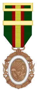 Is made of oxidized iron, oval, 42 millimetres (1.7 in) on its vertical axis and 28 millimetres (1.1 in) on its horizontal axis. On the obverse, surrounded by a silver edge, is a rising sun behind the sea and a matron stands, representing Spain, offering, with the right hand, a laurel wreath and holding a sword with the left. At the top of the oval are the words: "Al mérito distinguido". On the reverse is the emblem of the Army. The ribbon is 30 millimetres (1.2 in) wide and divided in three parts: the central with the national colours (red and yellow) and at the sides dark green. Each medal has a clasp attached to the ribbon with the legend of the action done in black.