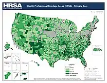 About 20% of Americans live in rural regions, but only nine percent of the country's doctors practice in rural areas.[18] Federal health officials predicted in 2019 that the number of rural doctors, half of them over 50 years of age, would decline by 23 percent during the next ten years.[9] A contributing factor to this decline is newly graduated doctors' reluctance to move to rural areas. While doctors originally from rural areas are more likely to return to rural areas to practice, rural Americans are less likely to attend medical school in the first place.[11] Newly graduated doctors have also tended to prefer jobs in hospitals, rather than jobs in family practices that are more common in rural areas.[19]