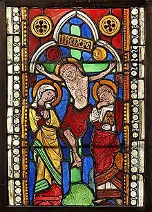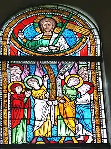 The oldest stained glass windows preserved in situ in Sweden are found in Dalhem Church on Gotland.[26] Five of the thirteen window panes in the eastern choir window are original; the rest date from a restoration done in a medieval revival style 1899–1914.[27] Each window pane is approximately 50 centimetres (20 in) by 60 centimetres (24 in) large.[28] These five windows probably date from c. 1230–1250; a somewhat later window in one of the northern choir walls (c. 1250–1280) show similar stylistic traits. These early works are characterised by an influence from Byzantine art. Stylistically related works can be found in Western Germany, particularly Westphalia, and notably in St. Elizabeth's Church, Marburg.[27][28][29] Comparisons have also been made with windows in Barfüßerkirche[30] in Erfurt and Neukloster monastery.[25] The Byzantine influence, as seen e.g. in the representation of Christ Pantocrator in Dalhem, thus probably arrived with craftsmen from western Germany, who are also known to have been active as tradesmen on the island at this time. A clearly Western element in the aforementioned representation of Christ is thus e.g. the cross flag that Christ holds.[31] Roosval also notes that a particular way of depicting the hair of Christ can be seen in the window in Dalhem, in Marburg and in the Byzantine mosaics in Cefalù Cathedral on Sicily; his conclusion is that the stylistic influence from Sicily may have reached Germany perhaps via the court of Emperor Frederick II, and from Germany to Gotland.[32] Apart from Dalhem, window panes of broadly the same style and age are also known from Atlingbo, Barlingbo, Eksta, Endre, Lojsta, Rone, Sjonhem and Väskinde churches.[33]