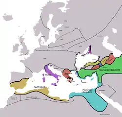 Between 1275 and 1344 a struggle for the control of the Strait of Gibraltar took place. Featuring the Marinid Sultanate, the Nasrid Kingdom of Granada, the Crown of Castile, the Crown of Aragón, the Kingdom of Portugal and the Republic of Genoa, it was characterized by changing alliances between the main actors.[25] The iberian cities of Tarifa, Ceuta, Algeciras or Ronda and the African port of Ceuta were at stake.[25] The Western Mediterranean sea was dominated by the Crown of Aragon: thanks to their possessions of Sicily, the Kingdom of Naples, the Kingdom of Sardinia, the Balearic Islands, the Duchy of Athens the Duchy of Neopatria, and several northern African cities.