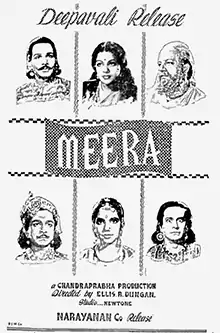 Meera is a 1945 Indian Tamil-language musical drama film directed by Ellis R. Dungan, produced by T. Sadasivam and written by Kalki Krishnamurthy. Based on the life of the 16th century mystic and poet Mirabai, the film stars M. S. Subbulakshmi as the eponymous character, a zealous devotee of Krishna, who considers him to be her husband. Despite marrying Rana (Chittoor Nagaiah), she follows her own way of living, which is unacceptable to her husband and his family.