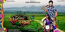 Mehandi Laga Ke Rakhna is a 2017 Indian Bhojpuri-language film written and directed by Rajnish Mishra and produced by Ananjay Raghuraj under banner of "Ananya Craft And Visions" and presented by "Om Sai Ram Entertainment" With association of "Trimurti Entertainment Media". It is a remake of the 2007 Telugu film Aadavari Matalaku Arthale Verule. The stars Khesari Lal Yadav and Kajal Raghwani while Ritu Singh, Awdhesh Mishra, Sanjay Pandey, Sanjay Mahanand, Karan Pandey, Deepak Sinha, Anand Mohan and others in supporting roles.[1][2][3][4][5] Choreographers from Bhojpuri Cinema industry Kanu Mukharjee and Glori Mohanta make a special appearance in song "Sakhi Re Var Pa Gaini".[6]