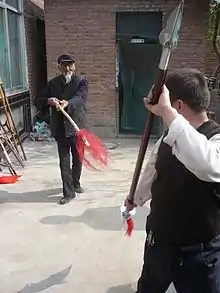 Master Zou Hongyi came from Xuzhou, on a little chariot. He traversed the Yellow River with four disciples, and with these weapons: Liuxingchui (流行锤), a Fenghuolun (风火轮), some Sanjiegun (三节棍, also named Da shaozi 大梢子), a Qijiebian (七节鞭), two Wenbang (文棒), a scale (上天梯Shang Tianti), a Qunqiangmu (群枪母), two Xiaoguai (小拐) Liangtianchi (量天尺), Yiben sanqiang (一锛三枪) , etc.[24]